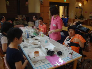 5月は園内活動にて、多肉植物の寄せ植えを行いました。多肉植物を初めて目にした方も多く可愛らしい植物に目を輝せながら自分のお気に入りの植物を選んでいました。職員と一緒にポットに肥料と土を入れ植え付けを行いました。カラフルにデコレーションを行い、可愛らしい寄せ植えが出来上がり、皆さんとても喜ばれていらっしゃいました。午後からは、出来上がった自分の植物を見ながらお茶会を行い、癒されているようでした。これからも皆さんが興味を持てるような活動を提供していきます。