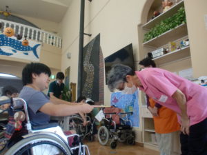 パソ松ヶ尾館では9月22日に「敬老会」を実施致しました。70歳以上の方にメッセージカードをお渡ししました。また、生き生き倶楽部のお二人にも日頃の感謝を込めて、利用者様よりプレゼントがありました。表彰の後は、茶話会を実施し長生きの秘訣などを話されておりとても盛り上がっておりました。コロナの影響でまだまだ外出できない日が続く中で、少しでもストレス発散に繋がったと思います(^▽^) 今後も利用者様が少しでも喜んでくださるような活動を立案して参ります。