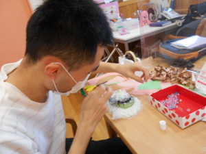 11月14日(土)に、喜々では創作活動でツリー作りに挑戦しました。画用紙を円錐にし、ご自分の好きなレースを付けてビーズをボンドで付けて製作されました。利用者様同士「レースの色はこれでいいか」「ビーズの色が綺麗」とか話しながら時間一杯集中して活動に取り組んでいらっしゃいました。利用者様の中には「もうすぐしたらクリスマスだね」と楽しみにされている方もおられました。午前中の活動でしたが素敵なツリーができお部屋が明るくなりました。