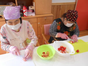 1月15日(金)喜々では慶会では初めてクレープ作りをしました。フルーツのカットから始めました。皆さん上手に苺や桃をカットされてから生地作りで材料の分量を測って混ぜてホットプレートに流しお玉で優しく丸を描きそれぞれ生地作りが出来てフルーツや生クリーム、チョコレートなどご自分が好きなトッピングをしました。「美味しそうに出来た」とか「初めて作った」とか色々な声が飛び出し、おやつの時間に皆さん満足そうに召し上がり笑顔が絶えませんでした。自分で作られたクレープは格別だったようです。
