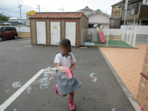 4月13日(火)に来夢では、シャボン玉遊びを行いました。活動に入る前に何に気を付けたらいいかな?とみんなで一緒に考えて発表しあいました!小さなシャボン玉をたくさん作って数を競ったり、大きなシャボン玉を作ることができるようにゆっくりゆっくり息を吹いたりと自分なりに遊び方の工夫が見られました。途中からは吹く道具だけでなくスティック状の物やリング状の物など様々な道具を追加!ぐるりと回りながらシャボン玉が自分の回りを囲む様子など大喜びでした。友達との道具の貸し借りなども優しい関わり合いもでき、ぽかぽかした気候の中で楽しく活動できました♪