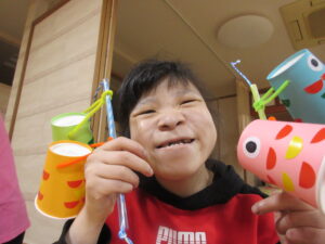 5月5日はこどもの日。こどもの日の趣旨って「こどもの人格を重んじ、こどもの幸福をはかるとともに、母に感謝する」ということが祝日法で定められています。母は偉大ですね!それにともない創作活動でこいのぼり作りを行いました。今年は紙コップを使ったこいのぼり創作を行い、紙コップにシールを貼ったり穴を開け針金を通してストローに付けたりの作業を行いました。皆様和気あいあいとおしゃべりしながらそれぞれのセンスで完成させていきました。可愛らしいこいのぼりを完成させて活動室に飾ると皆様ニコニコして喜んでおられました。今年も楽しくこどもの日を迎えられそうです。