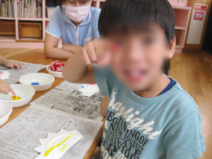 ニーニョスクラブⅡでは季節の壁面製作に力をいれました。2回にわたりシール製作とえのぐ遊びを通してカタツムリと傘の製作物を完成させました。今年の梅雨入りは例年よりも2週間早く、お外遊びにも思うように行けなくなった時に「雨が大好きな生き物な~んだ?」「雨が降った時に使う道具な~んだ?」と少しでも雨続きの日々のお子様の心が弾むような製作を提案し今回はお子様と一緒に飾りつけをしました。「ここがいい~!」と思い思いの場所に貼ります。壁面の前を通るたびに「ぼく、わたしのカタツムリ♪」と笑顔が見られました。引き続き梅雨明けまで楽しみたいと思います。
