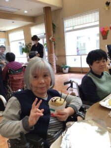 今月の園内活動ではクレープ作りを行いました。クレープ作りは以前より利用者からリクエストあり簡単に作る方法を模索していたところで、今回初めて企画しました。材料も業務用を準備することで作っているときはクレープ屋さんになった気分も味わえたと話ありました。食べられる時はクレープ袋を持ち口にクリームを付けられながらも完食されておりました。「美味しかったよ。またやろうね。」と好評でしたので、またの機会に実施していきたいと思います。