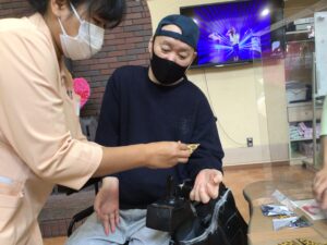 パソ松ヶ尾館では、2月の慶会のイベントとして、パソバレンタインと称してご利用者様にお菓子のプレゼントを行う企画を実施いたしました。ただお菓子をプレゼントするだけでは無く、ご利用者様に数字が書いてある紙に向かってスプレー缶を転がしていただき、当たった番号からくじを引いていただくという少し変わった形でのくじ引きを行ないました。スプレー缶が上手く転がらず、悪戦苦闘されながらも上手く転がすことができるととても喜ばれ、当たったプレゼントを見て笑顔が零れていました。