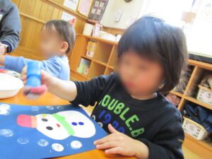 ニーニョスでは5日にスタンプ遊びを行いました。雪だるまのモチーフの周りに雪のスタンプをしました。最初はシールやペンで雪だるまの顔を作りました。白色の絵の具を付けてスタンプをすると綺麗な丸ができ嬉しそうな表情のお子様方でした。1回できると続けて「ポンポンポン」とリズム良くスタンプをする姿が見られました。雪だるまの下にもスタンプを押し、雪が積もっている様子を表現するお子様もおられました。個性あふれる作品がたくさんでき、お友達の作品にも目を向けて楽しむお子様方でした。