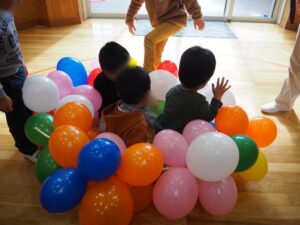 ニーニョスクラブⅠでは5日土曜日に風船遊びを行いました。始めはそれぞれ一つの風船を飛ばしました。風船の動きに合わせて追いかけて飛ばしていらっしゃいました。次に友達と一緒に同じ色の風船を見つけくっつけて飛ばすと、風船の動きが変わることに気付き「すごい!回ってる!」と目をキラキラさせながら、追いかけていました。次に2つの風船をくっつけ4つにし飛ばし、最後に4つの風船を1本の紐に結び一つの大きな風船にすると、みんなで飛ばしたり、中に入り楽しむ姿も見られ友達を意識しながら楽しむことができました。