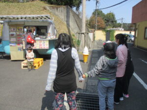 3月12日土曜日は児童のイベントでお買い物体験が行われキッチンカーが施設の駐車場に来ました。いいなぁと思って羨ましがっていたら、終わった後に他の事業所も利用していいという事になりましたので、チャルラルでもキッチンカーでお買い物体験を楽しみました。利用者の皆様、職員と仲良く手を繋いでまずは遠目にキッチンカーを観察、恐る恐る近づきキッチンカーと記念撮影、その後頼まれた商品をどれかな?と慎重に選んでお店の人に注文し、しばらくして出来上がった商品を受け取り支払いしてお買い物を完了しました。しっかりとお使いが出来て自信満々、自慢気に事業所に帰ってきました(^^♪