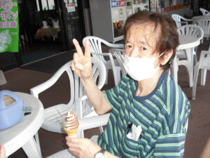 最近、暑くなり始め冷たい物が食べたくなる季節です。そこで、利用者のみなさんが大好きなアイスを食べに七ツ島のふるさと物産館までドライブに行きました。天気も良く、まさしくソフトクリーム日和です。到着と同時にソフトクリームめがけて足早にウキウキ気分。ソフトクリームを手にすれば、スプーンで一口ずつ味わって食べられる方、大きな口を開けて頬張りあっという間に食べ終わる方と皆さんとても満足そうに「美味しかったね。また食べたいね。」と満喫されておりました。
