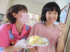 チャルラルでは、6月22日水曜日に慶会(6月誕生月利用者様誕生会)を行いました。ちょうど本日よりチャルラルを利用される利用者様がおられましたので歓迎会も一緒に行いました。午前は新利用者歓迎会を行い新利用者が自己紹介された後、先輩利用者様も一生懸命自己紹介をされ一人一人と握手して親交を深めました。午後から慶会でメロンパンアイス作りを行い、メロンパンを切ったり、アイスを詰めたりの作業を行い完成させ、おやつの時間に新利用者様も含め美味しそうに召し上がっておられました。今回も美味しい慶会で満足満足でした(^^)/