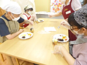 ビレイⅡでは、9月16日に調理を行いました。今回は利用者の皆様に秋を感じて頂きたく、和栗やあんこ、水羊羹など和の素材をトッピングした和風パフェ作りに挑戦して頂きました。また、和の素材以外にも果物やプリン、生クリームなどの材料も使用し、皆さん思い思いにトッピングされ、オリジナルのパフェを作られていました。とても豪華で、食べるのがもったいないくらい美味しそうなパフェが出来上がりました。が、食べるのをとても楽しみにされていた皆さんは、美味しい美味しいと笑顔であっという間に召し上がられていました♪そして、今度は何がいいかな~と次の調理も楽しみにされていました。