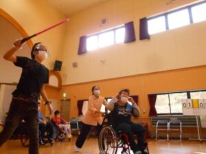 シャトル代わりに風船を使い、試合形式でダブルス対決です。風船はふわふわとゆっくり動くので皆が楽しむ事が出来ます。でも、強弱や方向のコントロールが案外と難しくて、風船の予想外の動きに皆さん汗だくになってゲームに集中です。その最中に突然のハプニング。パーンと大きな音を立てて風船が破裂。皆びっくりして慌てて耳をふさいだものの、すぐに大爆笑につつまれました。今日も身体をたくさん動かしストレス発散できた皆さんなのでした(*^-^*)