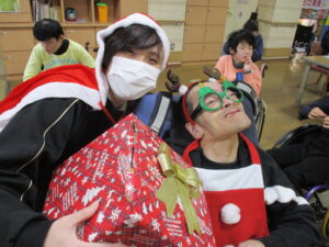 チャルラルでは、17日木曜日に園内活動を行いました。元々園外活動を行う予定でしたが寒冷前線の影響で急遽予定を変更しました。折角なのでクリスマスにちなんだゲームを行おうという事で、床にツリーに見立てた大きな点数版を作って、それに向かって段ボールで作ったクリスマスプレゼントを投げて落ちた地点の点数を競うゲームを行いました。利用者の皆様、職員と協力したりして上手に投げられると満面の笑みで喜んでおられました。慶会や年末ジャンボくじの活動ではきっと素敵なプレゼントがある事でしょう!