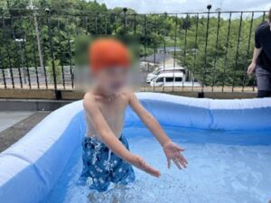 7月20日、ニーニョスクラブⅠでは、今年初めてのプール遊びを行いました!初めてのプールに笑顔が溢れるお子様方。冷たい水に体がびっくりしないよう、初めにそっと体に水をかけると、「冷たーい!」と嬉しそうな声が聞かれました♪お友達同士や職員と水の掛け合いや水鉄砲を使っての掛け合いを楽しむ中、お子様の中には顔に水がかかることが苦手なお子様の姿も見られましたが、手で顔をぬぐうことを伝えると、自身で水をぬぐうことができるようになり、水への抵抗感や恐怖感を少し緩和することにも繋げることができました!