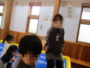 トランポリンの空気圧を弱くすると更にボヨンボヨンで不安定になる中「ヤバいー」「なんじゃこりゃ~」と口々に言いながら一生懸命に倒れないように踏ん張るお友達でした!楽しみながら体幹訓練に繋げられたのではないかと思います。
