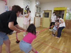 ニーニョ&ニーニャでは9月7日は親子でお月見会でした。ウサギ親子の演劇から導入を行い、お月見の由来を紹介して、親子でお相撲をしたり、綱引きをしたりしました。お母さん、お父さんに負けまいと全力でぶつかって笑顔で活動に参加する姿が見られました。最後に、おはぎづくりをしました。ご飯をにぎにぎ丸めて「おにぎりできたよ!」と元気よく声を上げる利用児の姿が見られました。あんこやきな粉を乗せて、出来上がったおはぎを親子でほおばって美味しく食べることができました。