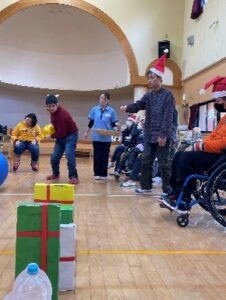 今回はリハビリを兼ねてのレクレーション大会です。サンタクロースのプレゼントに見立てた箱を並べて、先頭の箱にボウルを当ててドミノ式に箱をいくつ倒せるかを競うゲームです。2チームに分けての対抗戦とすることで、いやが上にも盛り上がりました。