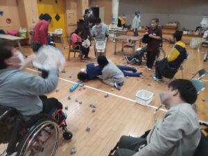 2月2日は節分が近いので「豆まき」をしました。豆といっても本物ではなくて、新聞紙を小さく丸めたものを代用しました。午前中のうちに全員で手分けして豆づくりをして、全部で200個ほど作りました。