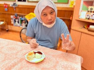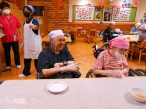パソ中山館では9月26日㈮の秋のお彼岸におはぎ作りを行いました。利用者の皆様職員と協力しながらラップにくるめられたもち米を丁寧に丸めていきました。「美味しくな~れ!」と気持ちを込めながら作りました。団子が出来るとそれにきな粉と餡子を乗せて完成させました。甘いものが好きな利用者様は少し量を多めにしたりしていました。完成品は本日の給食の肉じゃがと一緒に召し上がられ自分で作った分より美味しく感じられているようでした。お腹も満たされ今宵は良い月が見られそうです(^_-)-☆
