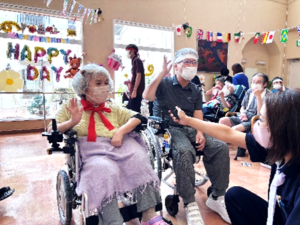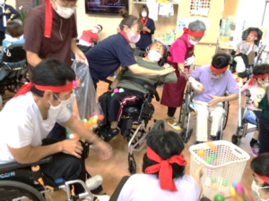 9月9日(火)、パソ松ヶ尾館では、秋の大運動会を開催いたしました!今回は午前と午後、一日使っての開催です。選手宣誓から始まった午前中の競技は、玉入れと大玉転がし!音楽に合わせてダンスも踊って、皆様楽しそうです(^^)午後は障害物競争に、職員による仮装飴食い競争です。ご利用者様と職員を混ぜて、赤と白の対抗戦で行われた運動会はとっても盛り上がり、一日中たくさんの笑顔が溢れました!また来年も秋の行事を楽しみましょうね♪