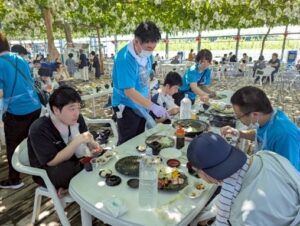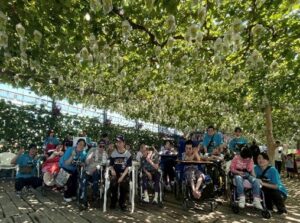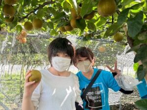 9月園外活動で霧島さくらフルーツランドにて、昼食はドーム内のたわわに実るシャインマスカットの下で利用者・職員一緒にバーベキューを楽しみました。まだまだ暑さが続く中でしたが、野外バーベキューは普段味わえない雰囲気で美味しく、楽しくたべることが出来ました。食後には芝の上を散歩し、ソフトクリームやぶどうそのままのスムージーや生ジュースも農園のその場で味わえる味で美味しかったです。梨狩りは初めての経験の利用者様も多く、梨園に入ったことも初めて。実った梨を観るのも初めて。ご自分で採った梨を食べるのも初めて。と初体験づくしでした。梨は帰館後に夕食のデザートとして思い出話をしながら召し上がられております。