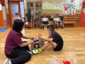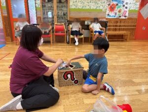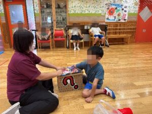 9月12日(金)に楽々にて?ボックスを行いました。箱の中に手を入れて何が入っているか当ててることもできました。お子様の中には手を入れていましたが、穴から直接見て答えるお子様もいらっしゃいました。その後職員が指定を行い、箱の中に手を入れ、感触を確かめていき、指定されたものを上手に取っていく事ができていました。お子様の中にはなかなか指定された物を当てる事が難しく、探し直していましたが、見つける事が出来ると笑顔を浮かべながら、「できた」と喜ぶ姿が見られました。