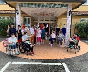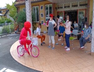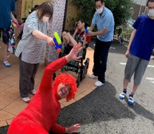 まだ夏を思わせる暑い毎日続いておりますが皆様いかがお過ごしでしょうか?喜々では熱い毎日を少しでも楽しんでもらいたいと職員が【猛暑】に仮装して利用者様と職員が一緒に打ち水を行い猛暑をやっつけよう!というレクリエーション活動を行いました。いくつもの水鉄砲を準備し1人ずつ好きなのを手に取り猛暑が来るのを待っておりました。最後は猛暑が横に倒れ「参りました~」と言って逃げていきました。勝利した利用者様と喜びを分かち合い集合写真を撮りました。皆様のおかげで施設周辺の気温も下がり地球温暖化にも貢献いたしました✌