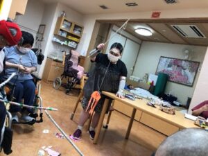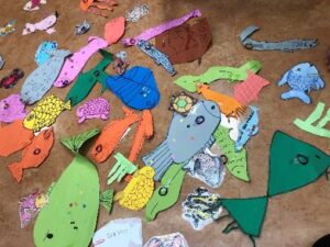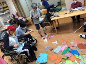 コルテでは週に4、5回のペースでレクリエーションを行なっています。10月6日㈫は魚釣りゲームを行ないました。床を漁場に見立ててそこに利用者様製作の魚を置いて泳がしていきます。利用者様かなり個性的な魚を作られ、これは深海魚?足のついている魚??宇宙人?と見ていて楽しい魚たちがウヨウヨ泳いでいて個性的な漁場になっています。利用者の皆様釣りの腕前は凄く。入れ食い状態で次々に釣りあげていきます。大きい魚だけを狙われる方、小さい魚をコツコツ釣り上げる方、釣り方にもそれぞれ個性が出て面白いです(*^_^*)