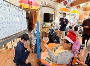 本日の慶会では少し早いクリスマス会を行いました。午前の部ではジングルベルを歌った後に、ゲームを行いました。上から落ちてくる布をキャッチするゲームや手で押して色んな言葉や音楽を奏でる玩具で皆で遊び、笑顔が見られました。午後の部ではビンゴ大会で景品をゲットしました。中々ビンゴにならず、あと一つの方もいらっしゃいまして、大変な盛り上がりが見られました。最後にケーキを召し上がり、誕生者のお祝いをして、ゲームやビンゴゲームがとても面白かったと感想が聞かれました。