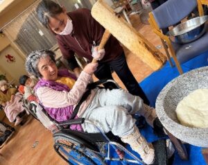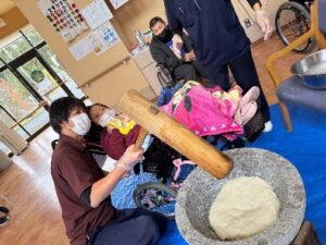 12月26日(金)パソ松ヶ尾館では、餅つき大会が行われました!「よいしょ!よいしょ!」の掛け声で力いっぱい杵を振り上げ、利用者と職員で力を合わせて餅をつきましたよ!周りで見守るパソの利用者のみなさんも、大きな声で声援を送り、餅つきの順番を待っていました(*^_^*)みんなで力を合わせて出来あがったお餅は綺麗に丸めて、鏡餅に大変身!今年一年たくさんの行事がありましたが、大きな怪我や事故なく無事終了することが出来ました。来年も良き一年になりますように(^_-)-☆