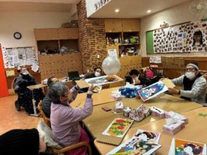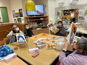 コルテでは1月8日木曜日にレクリエーションで正月遊びとして羽子板遊びを行ないました。段ボールに羽子板の絵を貼り付けて大きめのオリジナルの羽子板を作って、皆で風船を落とさないその羽子板でついていく遊びを行い。最初は「そ~れ!」「そ~れ!」と上品な掛け声で正月らしく行なっていましたが、段々と物足りなくなり途中から強めのアタックを交えながら、「ほい!ほい!」「声出して行こう!」と運動系の部活のノリになっていきました(*^_^*)それはそれで楽しい活動になりました。最後は女性利用者様で羽子板を持って記念撮影を行いなんとか正月らしく締める事が出来ました(*^_^*)