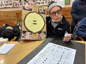 コルテでは1月9日金曜日にレクリエーションで正月遊びとしてとんとん相撲を行ないました。正月は日本の国技の相撲で楽しもう!ということで東西に分かれて対抗戦を行ないました。訓練室の中央に手作り土俵を置いて、利用者様の名前に山をつけて「西~○○山、東~○○山」と呼び出しに呼ばれると、皆様それぞれ自分の名前が入った紙力士を持ってきて行事に中央で組んでもらい、準備が出来たら「見合って見合ってはっきょ~い残った!」の合図とともに土俵を叩いて勝負が始まります。3回勝負で決戦してどれも接戦の好勝負ばかりでした。大声を出したり、体を動かしたり正月の運動不足を楽しみながら少し解消出来ました。(*^_^*)