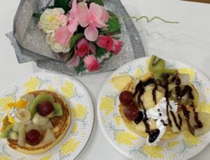 喜々では水曜日に調理体験を行っています♬今回は【パンケーキ】作りに挑戦いたしました!まず卵を割り、牛乳も加えて生地を作っていきます。混ぜて頂いたら包丁を使用してトッピングのフルーツをカットして頂きました。生地を自分達で焼いて上手に裏返しをされていました!おやつの前にトッピングを机の上に並べてバイキング形式で「どれにしようかな~☺」と楽しそうに選ばれておりました。生クリームやメープルシロップ、チョコシロップなど利用者様のお好みで「美味しい!💖」と嬉しい感想がたくさん聞かれています