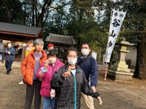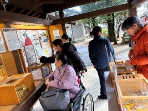 1月13日にドライブで谷山神社に行きました。天気が心配でしたが、晴れになりとても良かったです。賽銭・おみくじ引き・お守り買い等を利用者様それぞれしております。お参りの時には、願いを込めて手を拝む姿もみられました。今年の願いが、叶う様に頑張ると言う利用者様もおりました。くじを引いた利用者様は、内容を職員と一緒に読んで頭の中に入れている様子がありました。