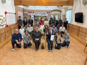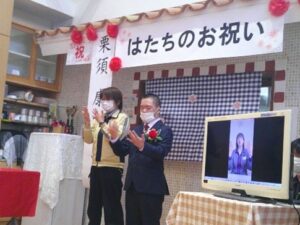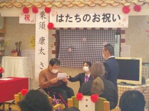 初めに成人される利用者の方へ、職員や利用者の方からお祝いの言葉をかけて頂きました。そして、ご本人様より成人の誓いの言葉を述べて頂きました。とても緊張されている様子でしたが、とても立派に述べて下さいました。最後には、利用者の皆さんと職員みんなで、「幸せになろうか」の歌を、手話を交えながら全体で合唱しました。
