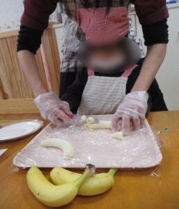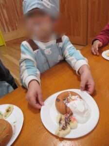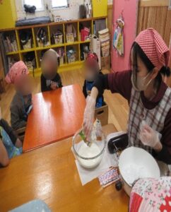 今日はバレンタインクッキングを行いました。ドーナツをクリームやチョコ、バナナやカラフルシュガーを使ってオリジナルドーナツを作りました。最初に職員と一緒に泡だて器を使いクリームを仕立てました。初めて泡だて器を使うお子様が多くいましたが、皆初めて使う機械に目がキラキラしていました。飛び散らない様に気を付けながら行うことが出来ました。クリームを全体やドーナツの穴にかけて好きなようにデコレーションしました。出来上がったオリジナルのドーナツを食べるとおいしさと達成感でとても嬉しそうでした。