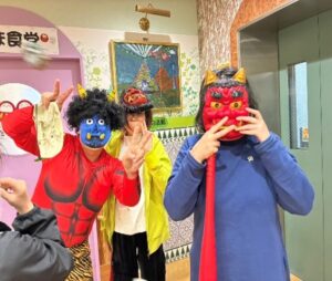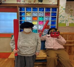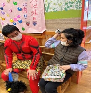 2月の行事イベントといえば節分がありますね!利用者様は本番までに新聞紙でたくさん丸めた豆の準備を行っていました(^_^)亀澤責任者が鬼になる役をすると利用者様2人が「私もやってみたい!」と積極的に手を挙げてくださいました。エレベーターから登場すると利用者様の「鬼が来たぞー」の声掛けでみんなで一斉に「鬼は外―!」「福は内―!」と声を出して豆をなげ始めました。フロアが笑い声に包まれ利用者様の楽しい様子が伝わってきます😆終わった後は豆を拾うのを手伝って下さる利用者様でした☆ミ
