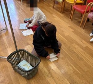 楽々では、3月5日(木)に洗濯物干し・たたみを行いました。タオルを使って、洗濯物の干し方の練習や畳み方を行いました。洗濯物を干す重要性等の説明をしたうえで、洗濯物を干す際にしわにならないように引っ張ってのばす方法を教え、お子様たちに実際にやってもらい、しわにならないように伸ばしてから干しています。干すのが終わった後はタオルを回収して半分に畳んでいき、かごの中に入れていく練習を行いました。終わった後はお家でもお手伝いするように声掛けをすると元気よく返事をしていました。