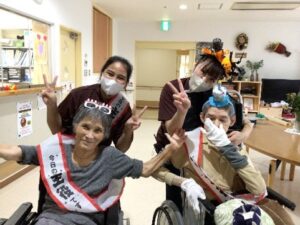 10月15日(火) パソ松ケ尾館では、ハロウィン★スタンプラリーを開催いたしました!他の事業所との交流で、チャルラル・エルディア・チャレットにご協力いただきました。各事業所をめぐり、スタンプシールを集めます!ハロウィン月ということで、ご利用者様も職員も仮装しての訪問♪かぼちゃやオバケ、恐竜に仮装して、「ハッピーハロウィン!」普段あまり交流のない他事業所ですが、皆様笑顔で挨拶です☆「久しぶり!」「元気だった?」との声もご利用者様の間で聞かれました。とっても楽しいスタンプラリーになりました!