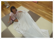 9月6日(水)ニーニョ&ニーニャではシーツ遊びを行ないました。どんな風に広げたらまっすぐになるかな?と引っ張ったり、みんなでシーツをかぶって寝て見たり・・・上手くシーツにみんなで入れるように頑張りました♪くるくると体の周りに巻いて「のーりー巻き巻き、のーりー巻き巻き♪」と音楽に合わせて、ひとりずつのり巻きの出来上がり!みんなで美味しくこちょこちょして食べました♪巻かれた後の暖かさに思わず目をつむって・・・気持ちよさそうでした♪