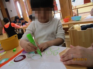 4月25日(金)、もぜでは親子で『端午の節句のお祝い』をしました。こいのぼりのお話を聴いた後、真っ白で寂しいこいのぼりを見ると、お子様から「私が綺麗にしてあげるよ!」との声が上がり、ペンで模様を描いたりウロコのシールを貼ったりと思い思いのこいのぼりを作って楽しみました。ペンでは好きな色を選んでダイナミックに模様を描き、その反面、シール貼りでは集中して慎重にシールを剥がしてペタペタペタ…。出来上がったこいのぼりを飾ると「ぼくのこいのぼり、あそこだよ!」と指をさして嬉しそうな子ども達。当日はあいにくの雨模様でしたが、晴れた日には外に飾って、元気におよぐこいのぼりをみんなで見たいと思います♪